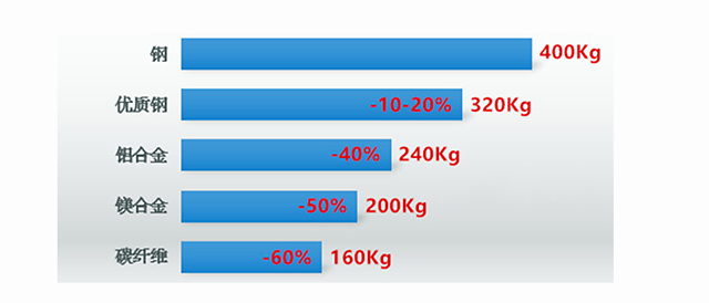 制作材料的轻量化才实现产品的减重目的,在工业生产行业实现减重的材料替换趋势是普通钢→热成型钢→铝合金→镁合金→碳纤维,各个材料的重量依次降低,但是比强度并不会减弱。想要达到400公斤的普通钢强度,碳纤维复合材料仅需要160公斤,减重效果对比如图: