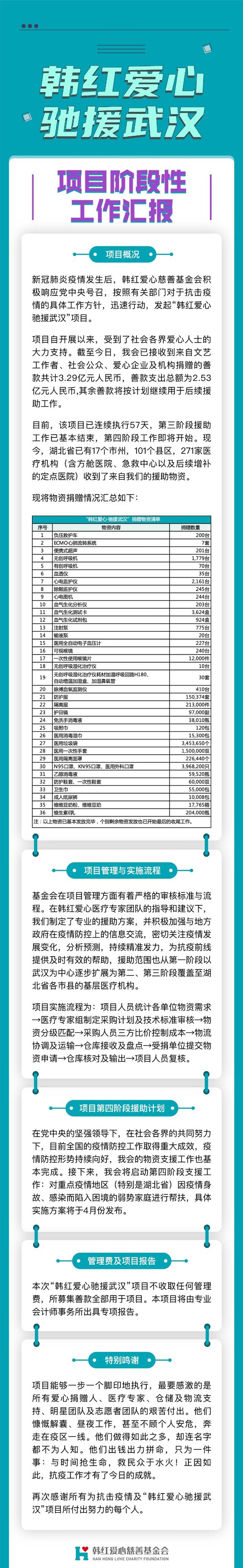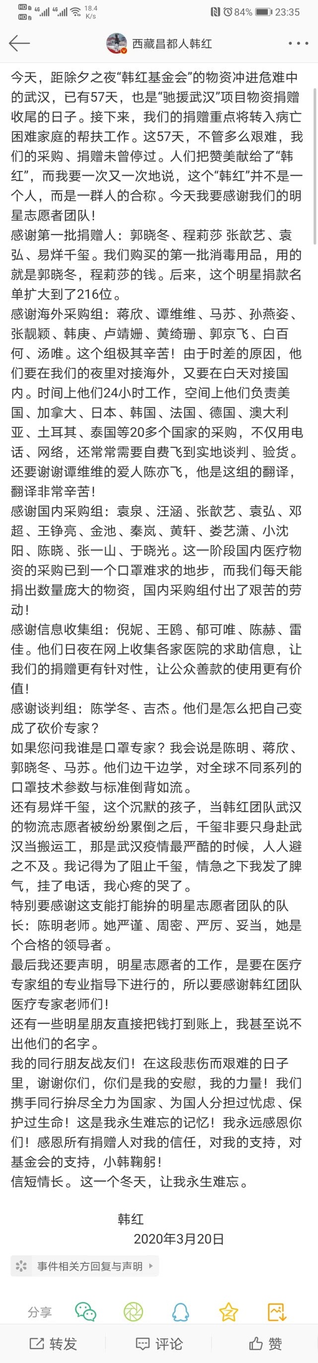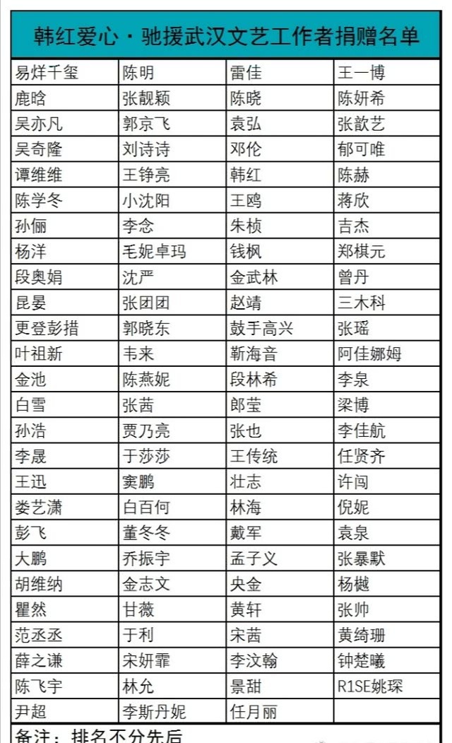 在这次疫情爆发初期,国内的各种医疗防疫物资非常的紧俏,韩红与她的基金会不仅在第一时间就为其前十分缺乏资源的医院送去了医疗物资,并且在后续的公益中,持续以不同的方式为武汉前线的医疗人员提供帮助。而在这条感谢信中,我们也了解到,这次冲在前线的公众人物不仅韩红一个,更有他集结的数百位明星朋友们。