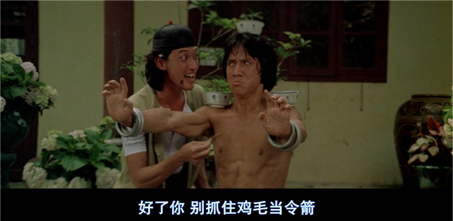 本片纯文戏量相当大,且喜剧水准高。例如成龙被黄麒英罚扎马步,师兄也就是石天为了报之前被他捉弄之仇,从鸡毛扫上拔下一跟鸡毛挠他,成龙恨痒难耐说他“鸡毛当令箭”。