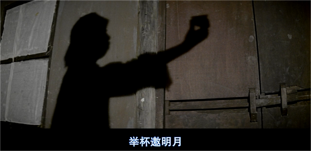袁小田开始教成龙醉拳之前,为了让他进入状态,与成龙对饮吟诗,画面与诗句直接对应,吟到“举杯邀明月,对影成三人”,镜头就给到苏乞儿墙上的影子。