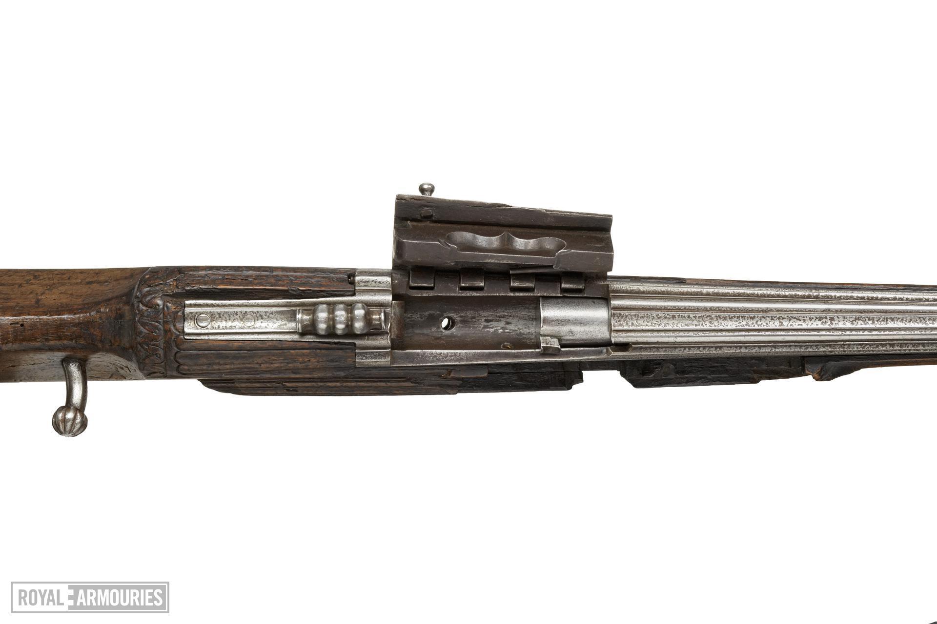 按理来说,枪械得发展到金属定装弹普及以后(19世纪中叶之后),后膛装填的武器才完全取代前膛。当然,诸如德莱塞针发枪(1841年),里福瑟边针枪(1836年)之类早期的先行尝试者也有。这篇的话主要和大家聊聊15世纪那会就出现过的后膛燧发武器。