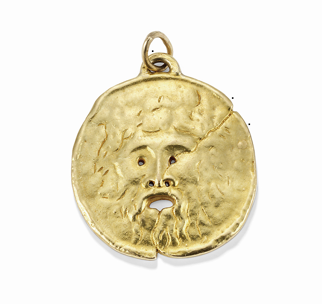 罗马假日吊坠(Roman Holiday Pendant)是一枚纯金材质的圆形吊坠,表面呈现出一张生动的面部肖像,双目圆睁,张开大口。它的设计灵感来自罗马希腊圣母堂门廊的大理石雕塑“真理之口” (Bocca della Verità),这堪称是一个中世纪的“测谎仪”,当时的人们认为它代表真理,如果有人说假话,伸进人面嘴里的手就会被咬伤。