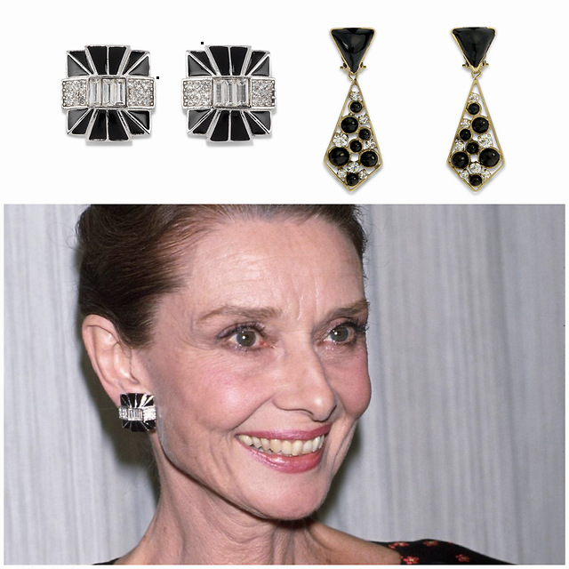 下图这两对装饰艺术风格(Art Deco)的黑色珐琅镶钻耳环,是纪梵希送给赫本的礼物。纪梵希采用了几何形与黑色珐琅搭配,并镶嵌了小颗钻石,尽显简约和优雅之美。赫本曾佩戴左侧这对耳环参加第17届艾美奖的颁奖典礼。