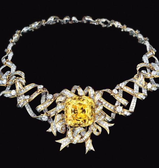 1957年,黄钻首次被镶嵌在钻石项链上,由当时的社交名媛玛丽·怀特豪斯夫人佩戴。时隔4年,蒂芙尼设计师让·史隆伯杰将它镶嵌在缎带外形的钻石项链中,赫本仅仅在拍摄电影宣传照时佩戴了这条黄钻缎带项链,就使这颗钻石蜚声世界,她当时还引用了济慈的诗句“美的事物是永恒的喜悦” (A thing of beauty is a joy forever)来赞美它。