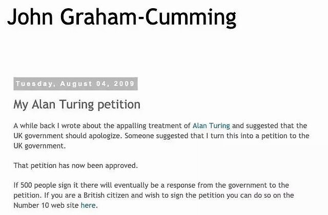第一次道歉:2009 年,英国计算机科学家康明(John Graham-Cumming)发起了为图灵平反活动,签名者超过了三万,英国首相布朗不得不发表正式声明向图灵道歉。