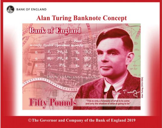 新的钞票上面除了会印图灵的个人形象之外,还会印上图灵用以破解德军密码的机器“英国炸弹”(British Bombe),以及图灵在 1949 年时说过的名言: “This is only a foretaste of what is to come, and only the shadow ofwhat is going to be”(这不过是对未来无限可能的一个预示,也仅仅是一个投影)。