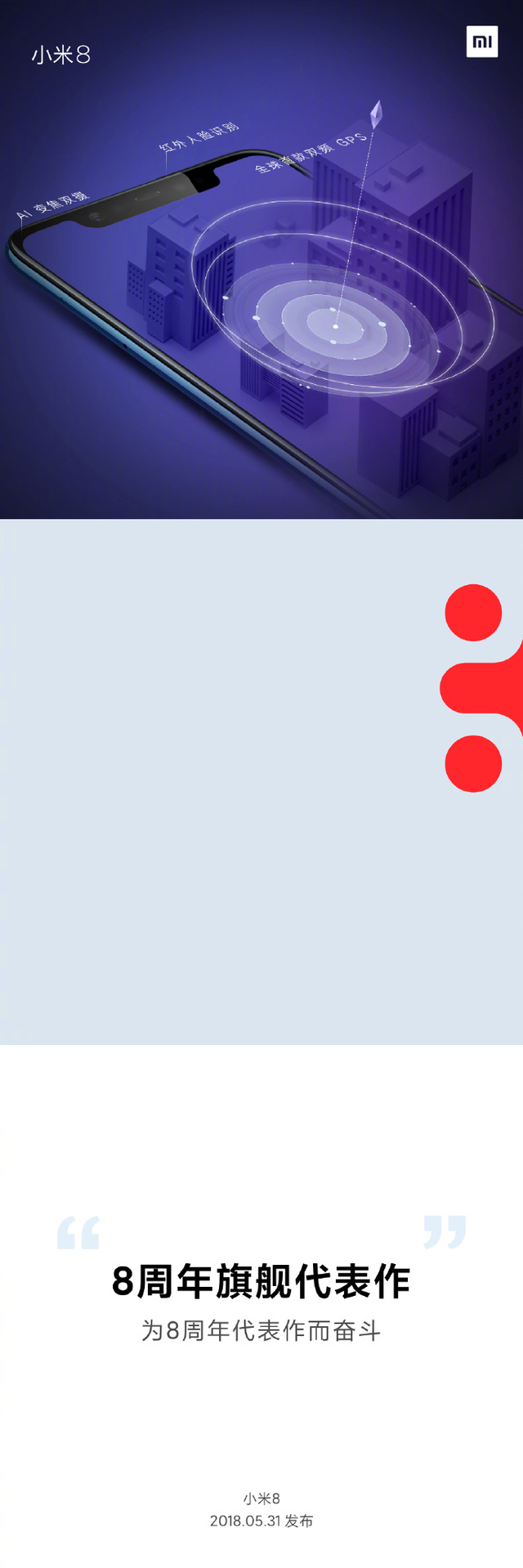 小米8:2018年5月31日发布,“8周年旗舰代表作。为8周年代表作而奋斗。”