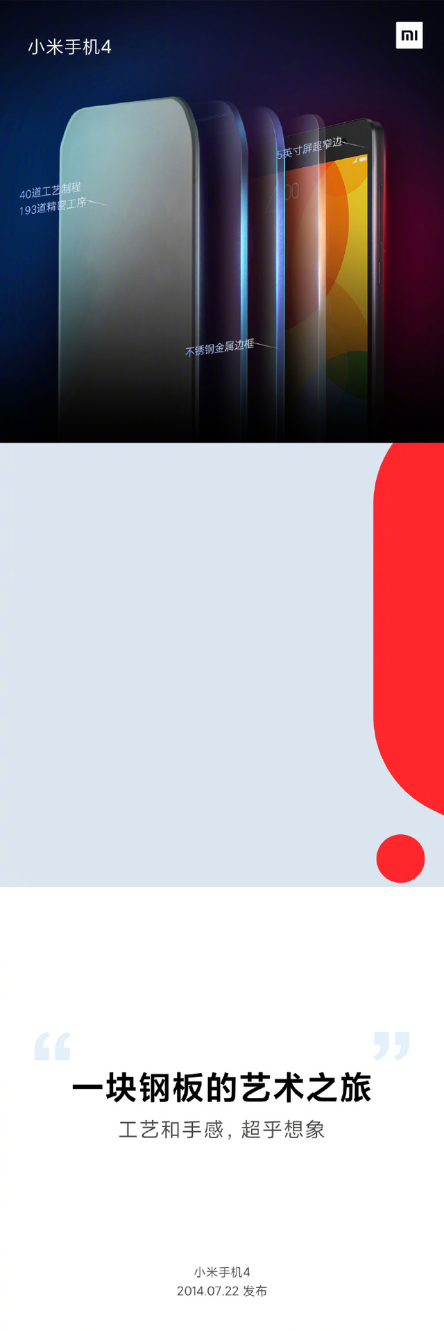 小米手机4:2014年7月22日发布,“一块钢板的艺术之旅。工艺和手感,超乎想象。”