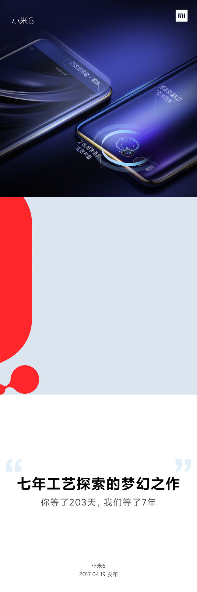小米6:2017年4月19日发布,“七年工艺探索的梦幻之作。你等了203天,我们等了7年。”