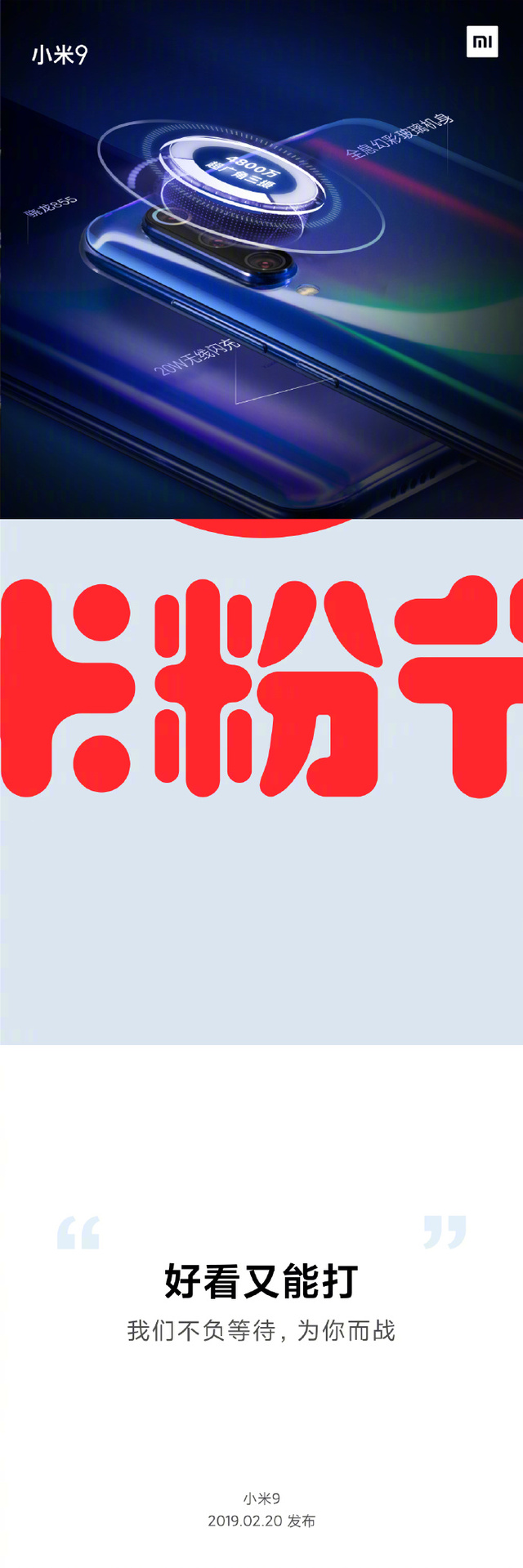 小米9:2019年2月20日发布,“好看又能打。我们不负等待,为你而战。”