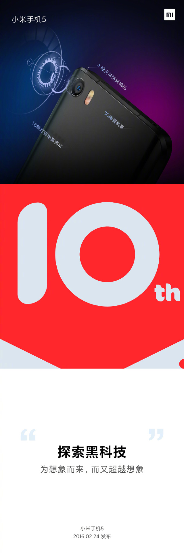 小米手机5:2016年2月24日发布,“探索黑科技。为想象而来,而又超越想象。”