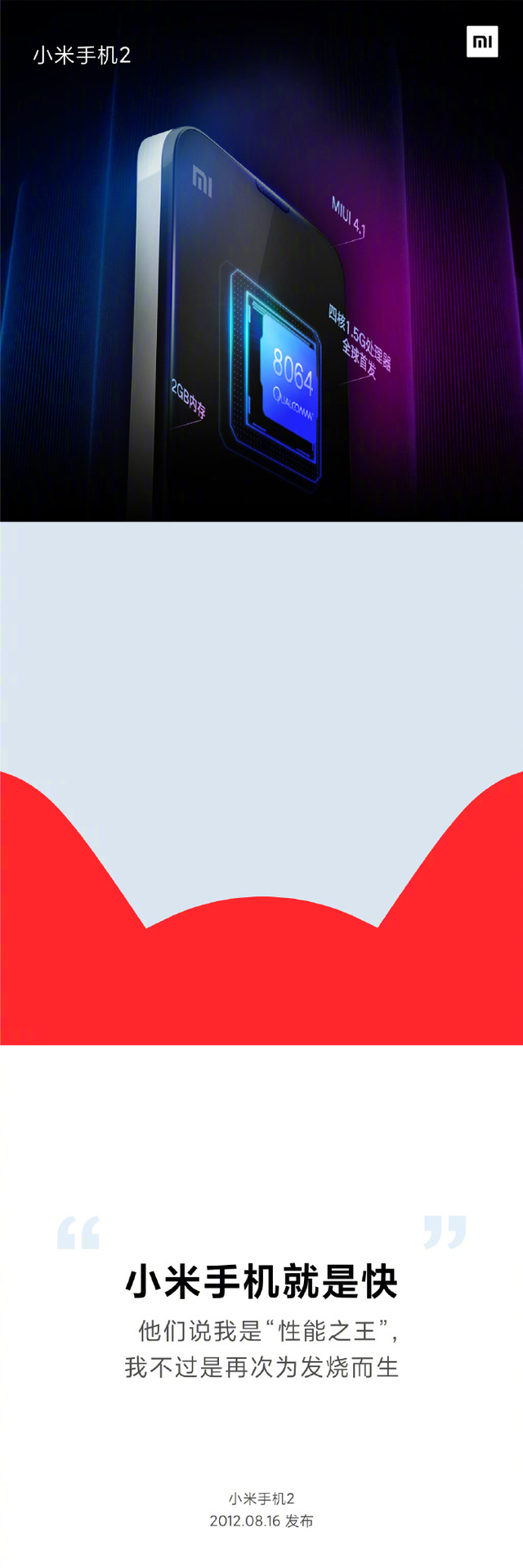 小米手机2:2012年8月16日发布,“小米手机就是快。他们说我是“性能之王”,我不过是再次为发烧而生。”