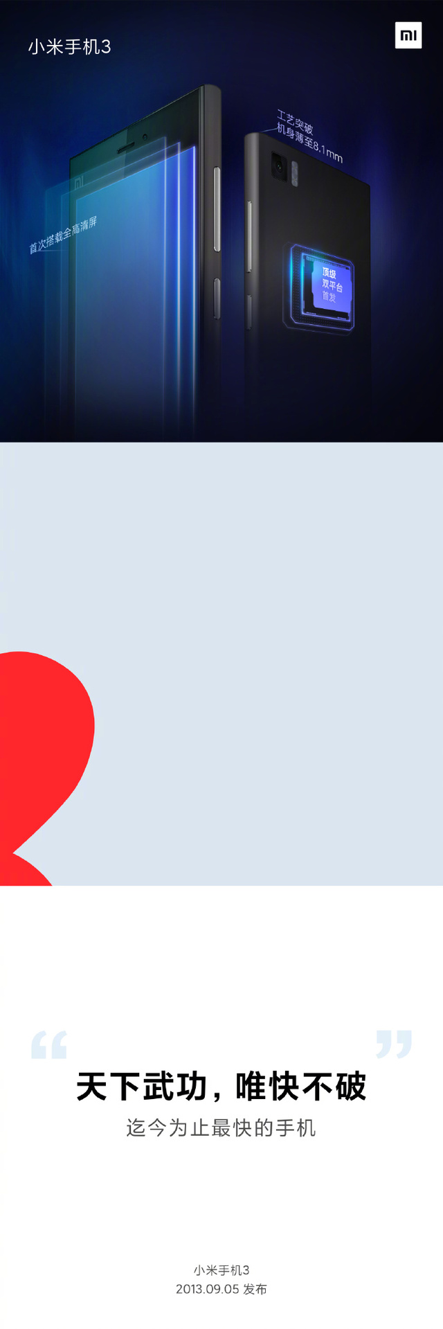 小米手机3:2013年9月5日发布,“天下武功,唯快不破。迄今为止最快的手机。”