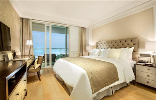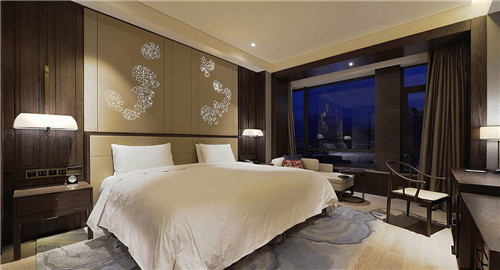 (4)就寝区:这是整个酒店客房中面积最大的功能区域。床头屏板与床头柜会成为客房设计的核心问题。为了适应不同客人的使用需要,也方便酒店经营,建议标准间两床之间不设床头柜或设简易的台面装置,需要时可折叠收起。至于集中控制面板就不要再提了,这是客房中最该淘汰的设备。床头柜可设立在床两侧,因为它功能很简洁,方便使用最重要,一定不要太复杂。床头背屏与墙是房间中相对完整的面积,可以着重刻画。
