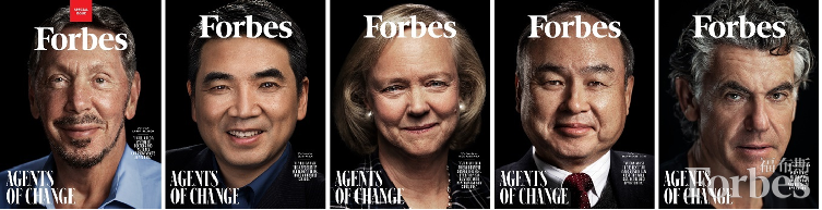 2020年全球亿万富豪榜一期英文版杂志有5个连续封面,封面人物包括拉里·埃里森、孙正义、袁征、梅格·惠特曼、迈克尔·托内尔。