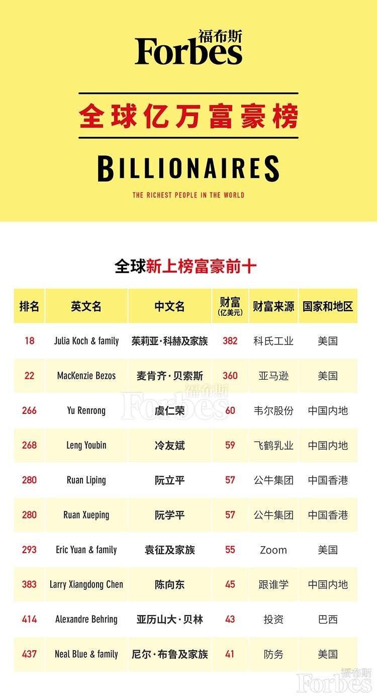 2020年福布斯全球亿万富豪榜共有178位新晋上榜者。此前,他们从未曾入选福布斯全球亿万富豪榜。其中,已故科氏工业集团CEO大卫·科赫遗孀茱莉亚·科赫(Julia Koch)、亚马逊创始人杰夫·贝索斯前妻麦肯齐·贝索斯(MacKenzie Bezos)与韦尔股份(603501.SH)董事长虞仁荣分列新晋上榜富豪的前三甲。