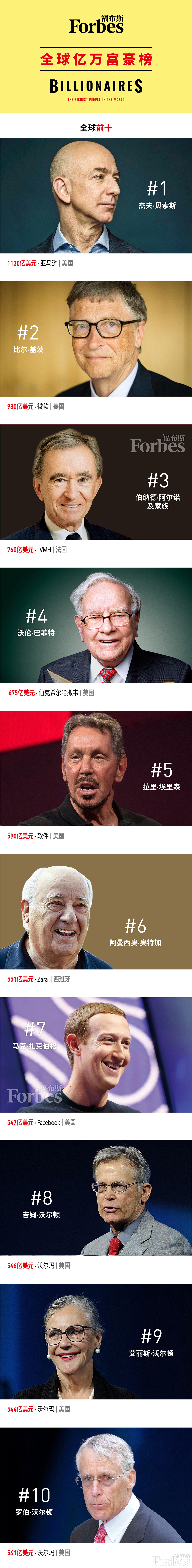 亚马逊首席执行官、身家过千亿美元的杰夫·贝索斯(Jeff Bezos)虽然财富值下降180亿美元,但是依旧连续第3年位列榜首。贝索斯今年榜单上的身家为1,130亿美元,少于去年的1,310亿美元。贝索斯的身家之所以下降,主要是因为不久前的离婚。比尔·盖茨依旧为第2位,财富980亿美元,比去年增长了15亿美元。LVMH的伯纳德·阿尔诺排名有所上升,并首次进入前3名,名列第3位。此前,沃伦·巴菲特(Warren Buffett)的财富下降了150亿美元。巴菲特名列第4位,财富675亿美元,少于去年的825亿美元。甲骨文公司创始人、董事长、首席技术官拉里·埃里森(Larry Ellison)排名第5位。埃里森虽然排名上升,但是今年财富下降了35亿美元,降至590亿美元。