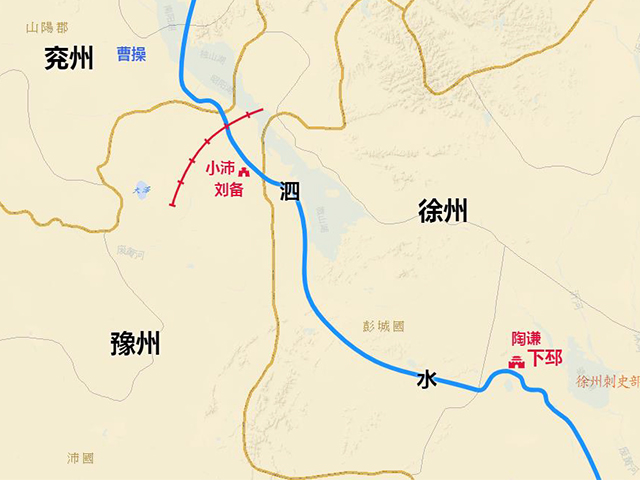 徐州的州治在下邳,曹操想要消灭陶谦,需要顺着泗水向东南方向进攻。小沛也紧挨泗水,并且位于下邳的上游地带,是曹操进攻的必经之处。陶谦让刘备驻守小沛,就是让他帮助自己抵挡曹操。