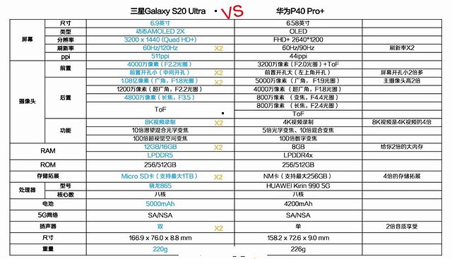 衡量一款旗舰机好坏的标准之一就是性能了,其中三星S20 Ultra搭载了目前安卓阵营性能最强劲的骁龙865芯片,虽然是通过外挂5G基带的方式来实现5G网络通讯,不过就性能方面来说,骁龙865几乎公认吊打华为阵营的麒麟990 5G。加上三星S20 Ultra使用了更先进的LPDDR 5内存芯片,更高的120Hz屏幕刷新率,所以在流畅度方面更有保障。而华为P40 Pro+虽然并不算差,但凭良心说其搭载的麒麟990 5G、LPDDR 4X内存芯片、90Hz刷新率确实不如三星S20 Ultra强劲。因此三星S20 Ultra性能优势更加明显。