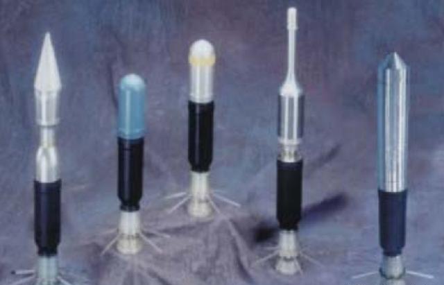 ■美国海军陆战队83毫米肩射多用途攻坚武器(SMAW)所使用的弹药种类,从左至右依次为:①Mk.118型高爆榴弹、②Mk.4型训练弹、③Mk.3型高爆双用途弹、④Mk.6型高爆反装甲弹、⑤Mk.80型温压弹