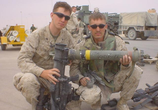■2004年11月,伊拉克,来自美国海军陆战队第23陆战团1营(1/23)B连的Paul Avery下士和Matt Raley下士,储弹筒上的“Schickster”字样是他们的战友Jacob P. Schick下士的绰号,而这位Schick下士在拍照前不久便受伤转往后方
