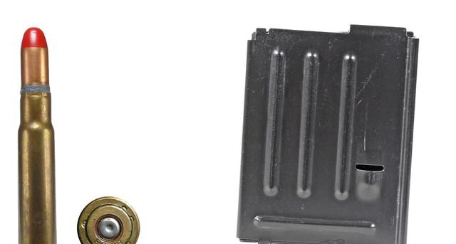 ■美国海军陆战队肩射多用途攻击武器(SMAW)所使用的9x51毫米Mk.217型示踪弹(左)以及其对应的6发装弹匣(右)