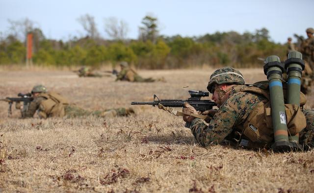 ■2015年2月15日,勒琼营,一名SMAW副射手正背负着储弹筒卧倒射击目标