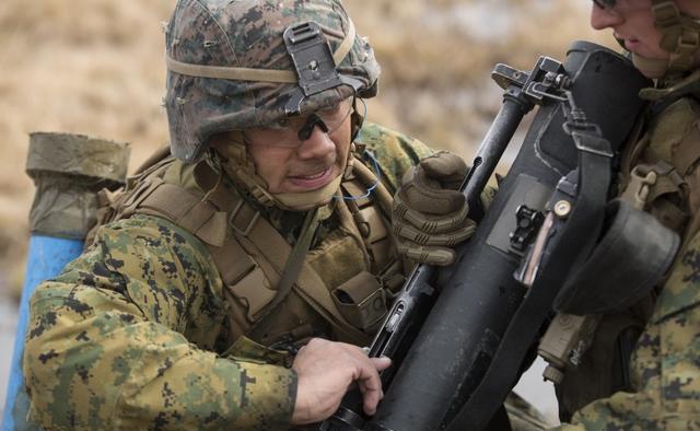 美国海军陆战队SMAW副射手为83毫米肩射多用途攻坚武器(SMAW)装填弹药时,只需要将装有相应弹药种类的储弹筒取下防尘盖,与SMAW发射器尾部连接并旋转一周即可完成装弹动作。