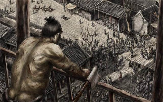 又见十字路口茶坊楼上一个彪形黑大汉,脱得赤条条的,两只手握两把板斧,大吼一声,却似半天起个霹雳,从半空中跳将下来。手起斧落,早砍翻了两个行刑的刽子手,便望监斩官马前砍将来。众士兵急待把枪去搠时,那里拦当得住,众人且簇拥蔡九知府逃命去了。