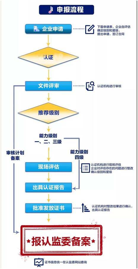 信息系统交付能力评估即针对信息系统服务商在整个信息系统交付活动过程中,通过基本能力、技术能力、人员能力、财务能力、管理能力和项目实施交付能力要素反映出来的交付水平的评估认证。信息系统服务交付能力等级认证分为一级、二级、三级和四级四个级别(一级为最高级别),其中一级、二级根据评估结果再分星级,星级分为5星、4星和3星(5星为最高星级)。通过评估认证后,报认监委备案,该认证证书信息统一在认监委网站查询。