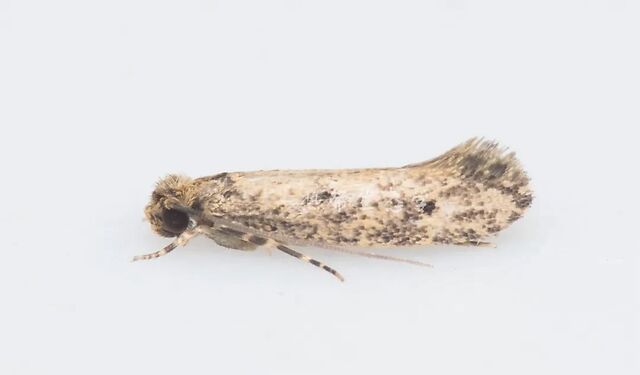 衣蛾Tinea pellionella (Linnaeus, 1758),可以通过幼虫只有头部和第一节是黑色、成虫的头部鳞片是均一的黄褐色而非杂色同无害的拟户鞘谷蛾区分,图改编自维基百科和Flickr, CC2.0。幕衣蛾Tineola bisselliella (Hummel, 1823) 是另外一个常见的衣柜杀手,但幼虫不会编制丝巢,成虫通体金黄无斑,这里没有放图
