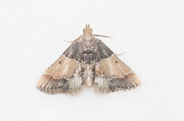 和繁盛的谷蛾科不同,我家里的螟蛾科少的可怜,连这两种最常见的都没有。倒不是说防治有方,恐怕只是因为经常做饭,家里粮食的轮转率很高,蛾子们还没等完成一代生活史,就已经被煮成熟饭了。不过最近还是有一只锅口逃生,出现在了厨房里,螟蛾属的斑粉螟Pyralis pictalis (Curtis, 1834),不是一种常见的仓储螟蛾,比之前介绍的两种体型要大一倍,翅长有10mm之巨。