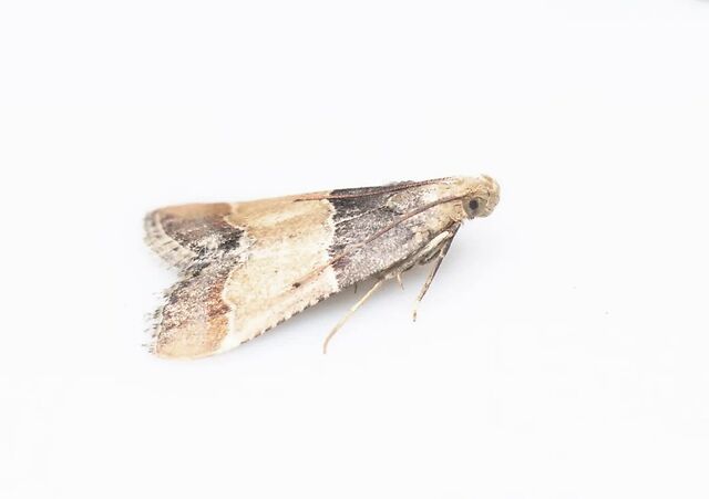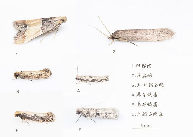 家里的谷蛾科关心你穿什么,螟蛾科惦记着你吃什么。这里的螟蛾科取的是狭义,草螟[亚]科那些颜值颇高的种类多数以新鲜植物为食,断不会在家里生存下去的。大多数人都对厨房里锐三角形的小蛾子有印象,这些蛾子才是屋里螟蛾该有的样貌。但其实这些肉眼看上去都差不多的蛾子包括了好几个相似的种类。据说最常见的是印度谷螟和干果斑螟。