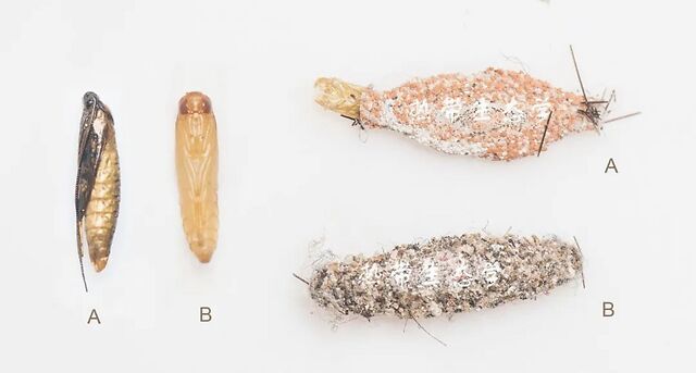 户鞘谷蛾的丝巢的材料不同,建筑风格也不同,上边的是探出头来的幼虫,体节上黑色斑点的数量和排列可以作为辅助识别特征,下边的成虫已经羽化,只剩一个蛹壳。
