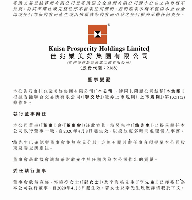 4月8日晚间,佳兆业美好发布公告称,翁昊辞任公司执行董事,以投放更多时间处理个人事务;同时,郭晓亭与李海鸣获委任为公司执行董事。即日生效。