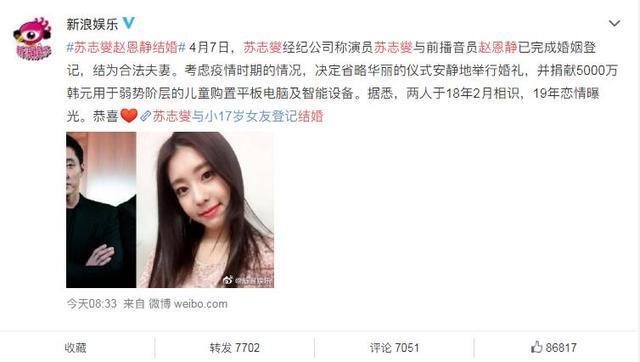 4月7日,经纪公司称43岁演员苏志燮与小17岁的前播音员赵恩静已完成婚姻登记,结为合法夫妻。考虑到疫情,决定省略华丽的仪式安静地举行婚礼,并捐献5000万韩元用于弱势阶层的儿童购置平板电脑及智能设备。