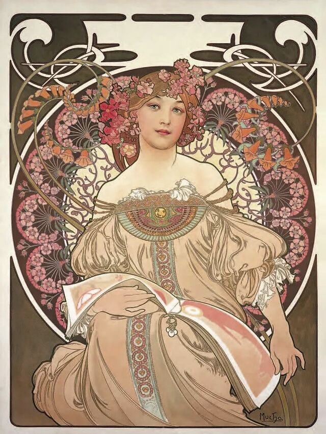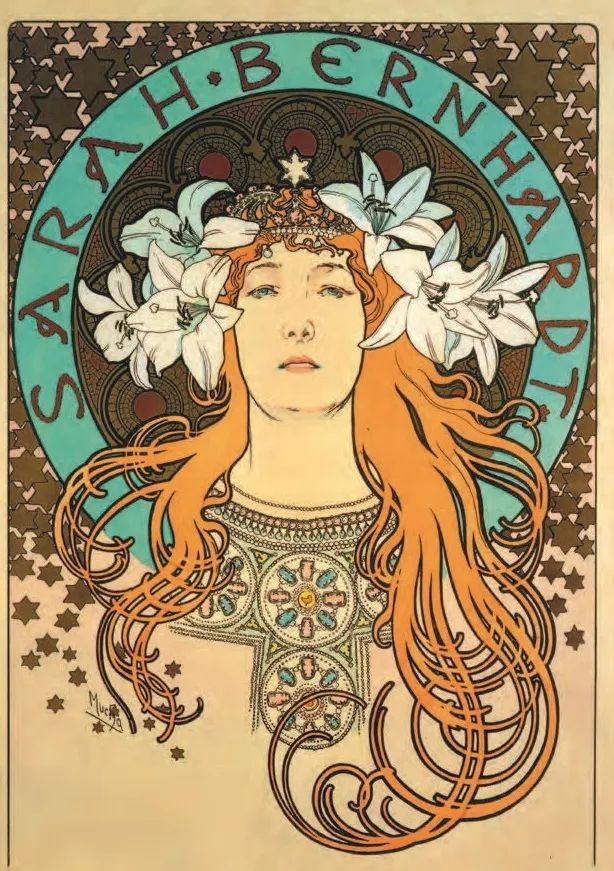 因为他幸运地结交了当时巴黎艺术界最受瞩目的明星莎拉·伯恩哈特女士,同时,海报这种精细的造型艺术表现手法也为他的成功推波助澜。