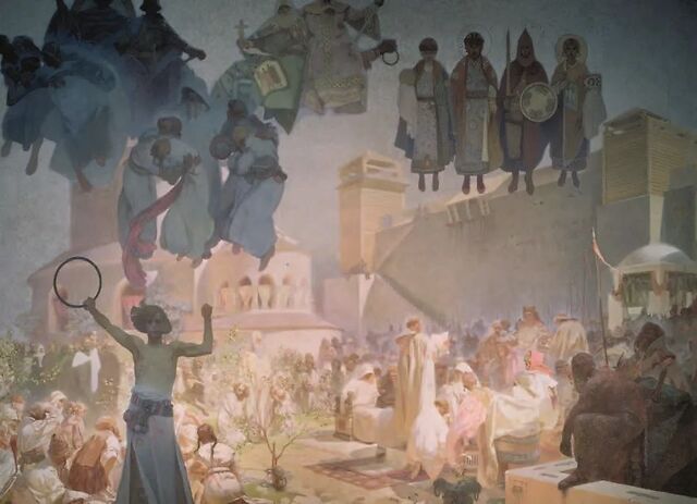 整组绘画由二十幅巨大的画作组成,慕夏选取了一系列历史人物和事件,以此回顾斯拉夫人的历史。