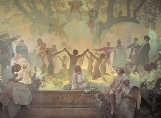 这组由12幅绘画组成的历史长卷以3幅反映史前文明的绘画开头,结尾则描绘了反映波斯尼亚的多种宗教信仰的三组人物,这组绘画展现了慕夏丰富的内心世界,也得以一窥他对民族的炽热之心。