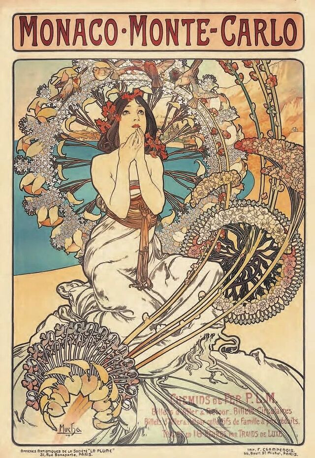 比如这幅《从摩纳哥到蒙特卡洛》,这是慕夏受巴黎-里昂-地中海铁路公司的委托而设计的,创作于1897年。