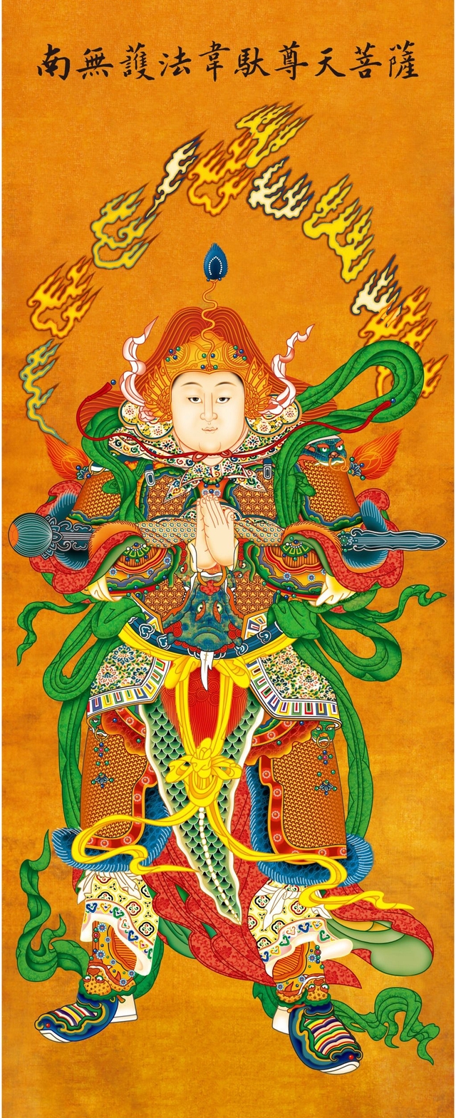 韦陀菩萨是佛教丛林的重要护法,负责寺院清净和平,为修行人扫除障碍,降服魔扰,他发愿成为贤劫(注释1)千佛中第1000尊佛——佛号名为“楼至佛”,在他成佛以前,拥护前面的999尊佛相继成道,以及佑护佛陀弟子修行之人。所以寺院的早课结尾都会祝赞韦陀。