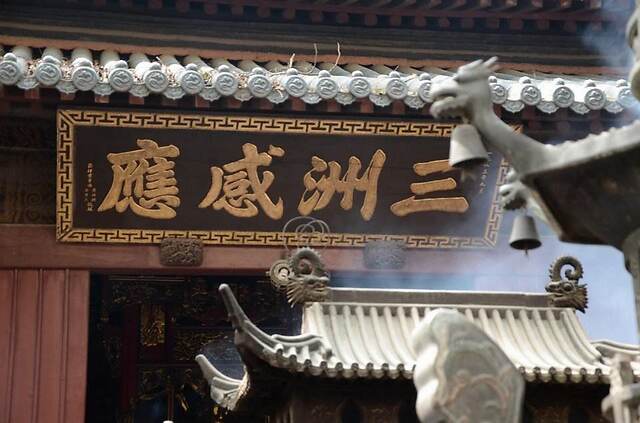 但是,当我们走出天王殿,在殿后韦陀菩萨的上方,悬挂着一块匾额,上写着“三洲感应”的金字。为何只提到了“三洲”?另外的一洲是什么?难道就不感应了吗?这就要说到韦陀菩萨的故乡——北俱芦洲了。