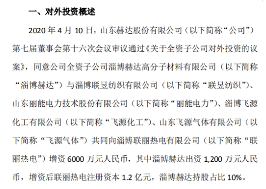 挖贝网 4月11日消息,山东赫达(002810)发公告称,2020年4月10日,山东赫达股份有限公司第七届董事会第十六次会议审议通过《关于全资子公司对外投资的议案》,同意公司全资子公司淄博赫达高分子材料有限公司与淄博联昱纺织有限公司、山东丽能电力技术股份有限公司、淄博飞源化工有限公司、山东飞源气体有限公司共同向淄博联丽热电有限公司增资6000万元人民币,其中淄博赫达出资1,200万元人民币,增资后联丽热电注册资本1.2亿元,淄博赫达持股占比10%。