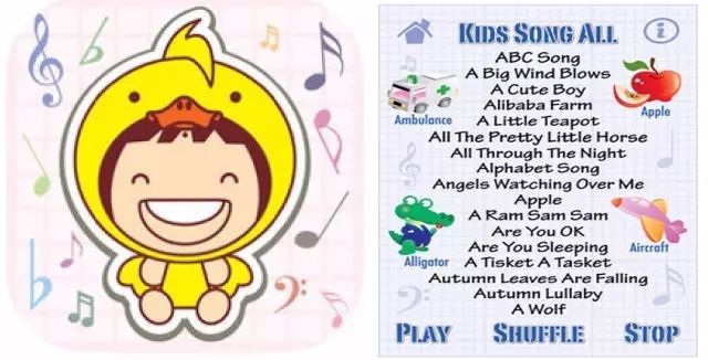 非常丰富强大的儿童歌曲软件。里面有220首儿歌。可以按照歌曲字母开头来选择儿歌,这样孩子也可以联系那个字母的发音。所有的歌曲都是儿童演唱的。