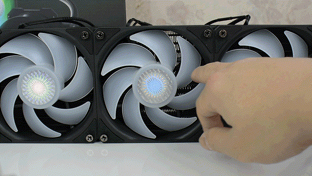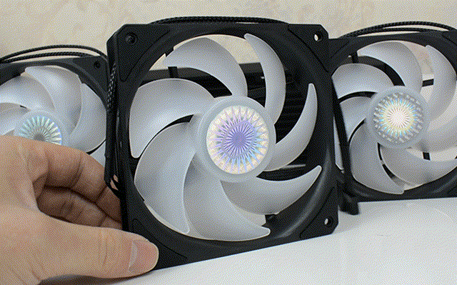 标配的3个120mm风扇,黑边框,白扇叶,扇叶采用7叶设计,乳白色可透光设计,扇叶中心位置还有炫光贴纸。