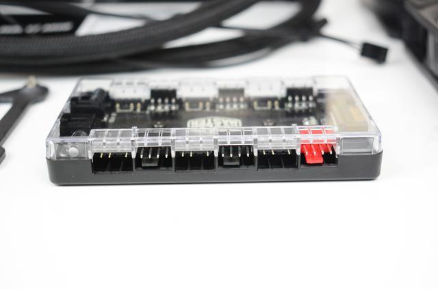 这个集线器,是我个人认为附件里面最有特色的,既集成了风扇4pin接口,也有ARGB的3pin接口,清点一下这个集线器一共有6个4pin fan接口,6个3pin ARGB接口,对于安装多风扇的用户来说,很好的解决了主板风扇接口不够的问题。另外,这个集线器需要接入电源的SATA线供电才能使用。
