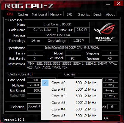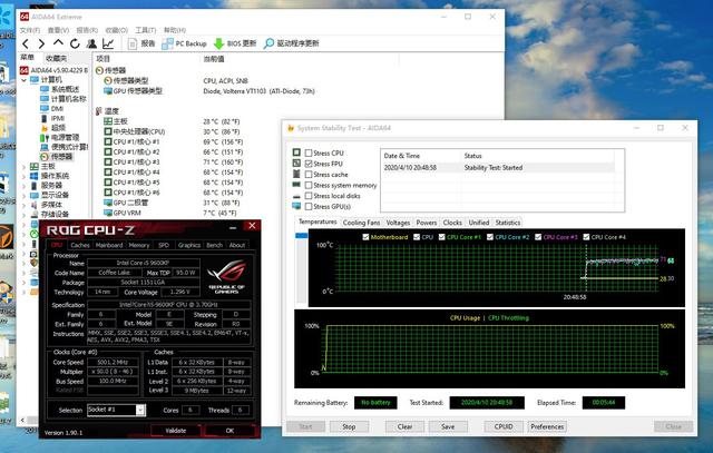 作为i5-9600KF,不超频到5.0GHz,好像有点说不过去,一不做二不休,直接拉到5.0GHz,经过多次调试,电压锁定在1.295V,素质还算不错,下面来烤机看看散热器的散热性如何。