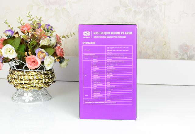包装上还有详细的产品信息,这款散热器支持所有主流平台,另外,这款散热器的尺寸也是标准尺寸,兼容性方面只要机箱支持360水冷就没什么问题,这款散热器质保2年,还不错。