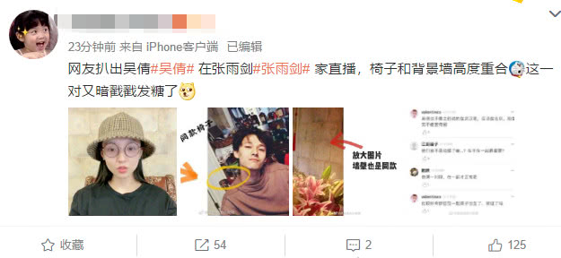 但接着网友又放出了墙壁也是同款的图片,只是吴倩直播时可能是开了滤镜的原因,显得墙壁颜色比较淡。一个椅子或许是巧合,但墙壁不可能刚好也是巧合,而且吴倩应该也没有必要将自己家的装修风格按照张雨剑家的复制粘贴。因此网友大胆猜测,吴倩是在张雨剑家进行的直播,并且两人很有可能是处于同居状态。