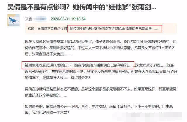 不管吴倩是否真的已生产,在网友看来,不承认就相当于是默认,两个的恋情在众网友眼里也已是板上钉钉的事。 出人意料的是张雨剑竟在近期直播中透露自己是单身,他如果是单身,那与吴倩之前被拍到约会的画面是怎么回事?难道两人只是处于暧昧期并未正式交往过?张雨剑的言语就等于间接否认了自己与吴倩的恋情,这让一众网友直呼“吴倩真惨”,张雨剑可是传闻中的“娃他爹”,现在卖单身人设,显得太不负责任。